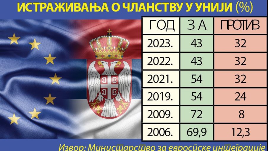 Podrška građana Srbije za pristupanje Evropskoj uniji splasnula je od 2012. godine, kada je zemlja dobila status kandidata. Istraživanje Ministarstva za evropske integracije pokazalo je da je 43 odsto građana bilo za članstvo, dok je 11 odsto bilo protiv, a sedam odsto građana je promenilo mišljenje i izrazilo da više nije za evropski put.